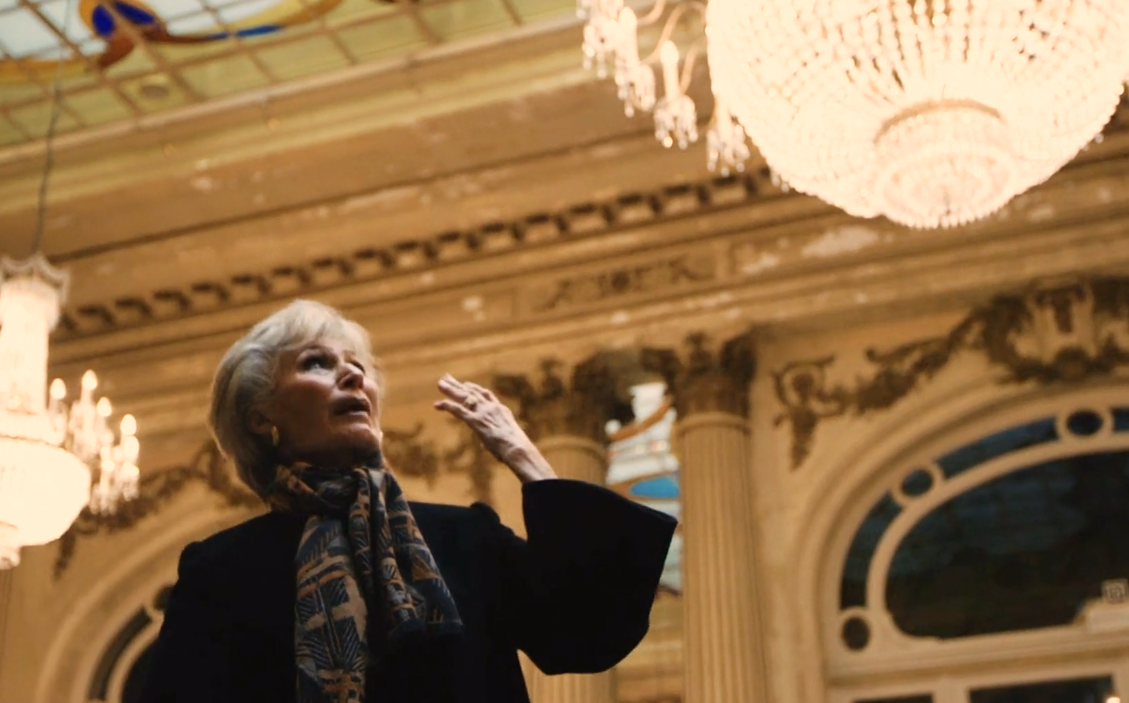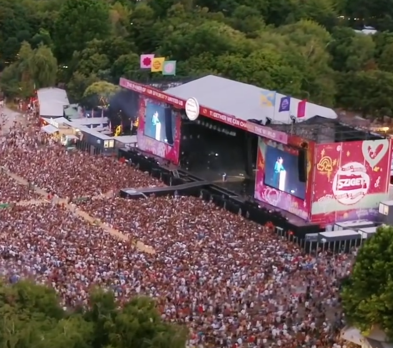 A large outdoor concert with a massive crowd in front of a stage surrounded by trees.